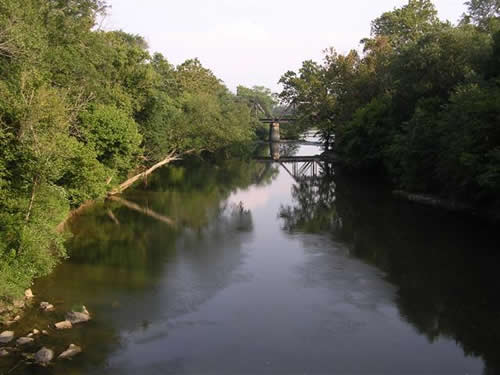 The Rappahannock looking downstream from the old, two-lane bridge. In the distance is the railroad bridge. You wouldn't know looking at it today, but this river played the part of referee each time ownership of the town changed hands between the boys wearing Blue and Gray. The anchors were removed from here, about midway between the two bridges.